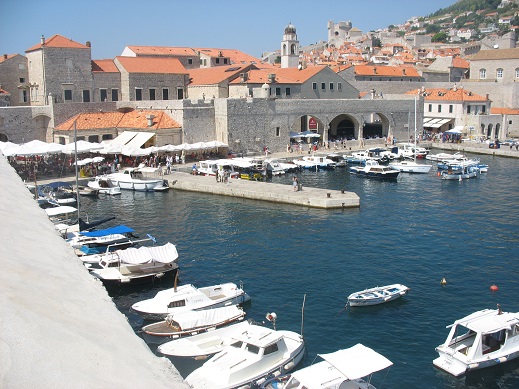 Belebter Stadthafen von Dubrovnik. Mit teurer Marina Gruz. Durch regen Bootsverkehr Schwell im Hafenbecken. Große Kreuzfahrschiffe legen hier an und bevölkern